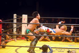 エプロンに出た澤と日高はトップロープ越しにエルボーの打ち合い(左写真)。