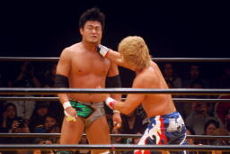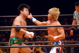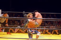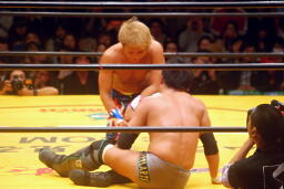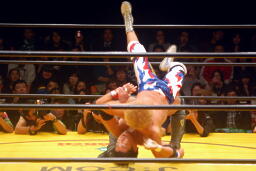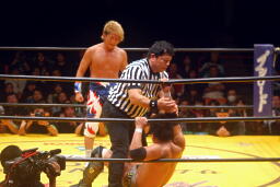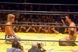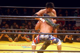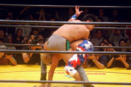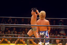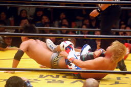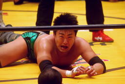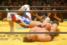 お卍固め(右写真)、体勢崩れ日高はロープ。