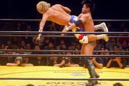 コーナーに上って足へのミサイルキック(右写真)。
