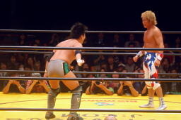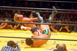 日高ローキック、ロープに飛ぶ、澤フランケンシュタイナー(右写真)。