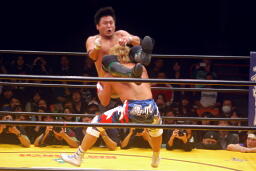 澤ハーフ&ハーフスープレックス(左写真)、カウント2。