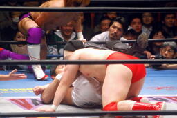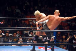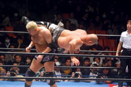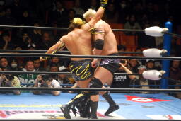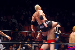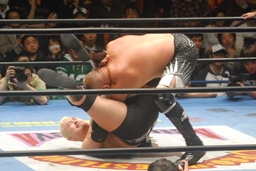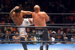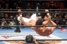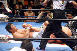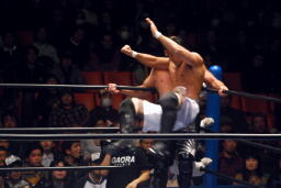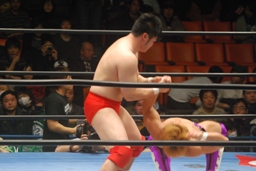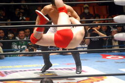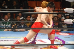 近藤前蹴り、稔かわしてローキック、近藤もかわす。稔ヘッドロック、近藤ロープに振る、稔ショルダーブロック。稔バック取るが近藤はKUBINAGE、一度は着地されるも近藤またKUBINAGE(右写真)、