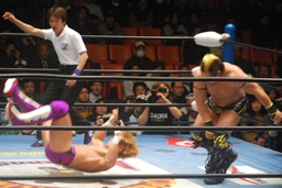 河野チョークスラム狙うが近藤はホイップで切り返す(右写真)。