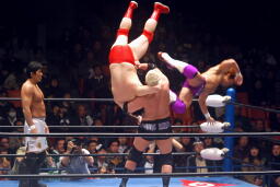 河野がブレーンバスター、そこに稔がミサイルキック(右写真)。