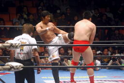 近藤ロープに飛ぶ、稔ドロップキック、近藤スカす。近藤ロープに飛ぶ、稔前転からのドロップキック(右写真)、河野にタッチ。