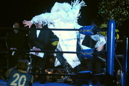 エクスプロイダー(左写真)、カウント2。武藤はエプロンに逃げる。
