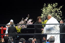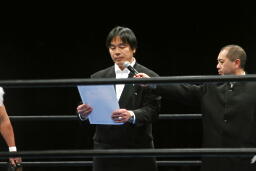 馳浩PWF会長が選手権宣言、なのだが宣言書は読まず「王者・秋山準と挑戦者・武藤敬司、今日は春分の日、春の大一番に期待します。」と(左写真)。