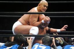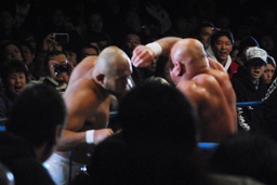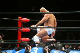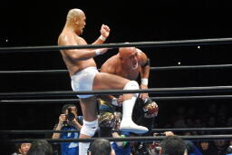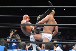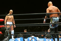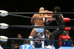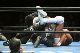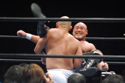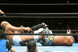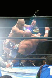 三沢式のフェースロック(左写真)、リリースしてカバー、カウント2。さっきのラリアット、ビッグブーツも小橋、田上の技ってことか?10分経過。