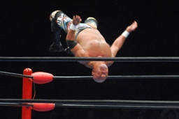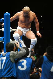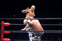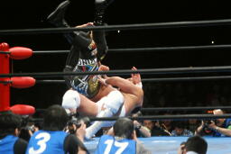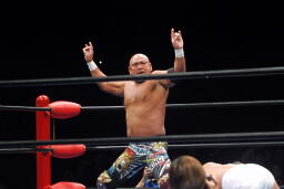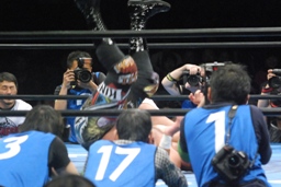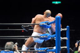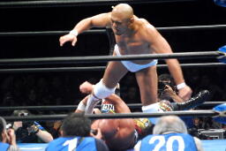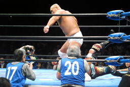 秋山はエプロンに引き出してニードロップ(右写真)、武藤は場外転落。秋山は場外マットをめくり上げてDDT。