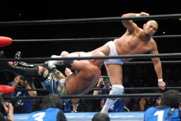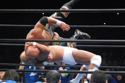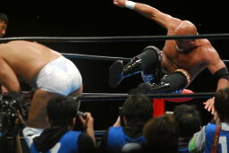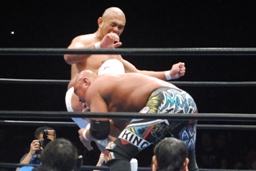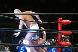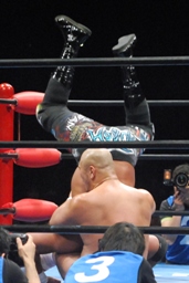 武藤突っ込む、秋山カウンターのキック、コーナーに上ってダイビングニーアタック、武藤はカウンターの低空ドロップキック(右写真)。
