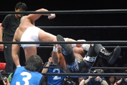 武藤は秋山を場外フェンスに固定してシャイニングウィザード(右写真)、フェンスに足を掛けてドラゴンスクリュー。