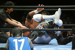 秋山キック、武藤キャッチしてドラゴンスクリュー(左写真)。両者場外に。