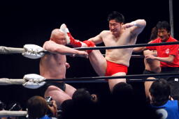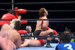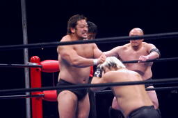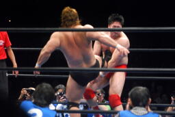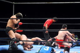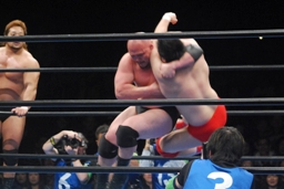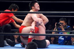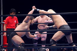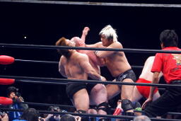 関本逆エビ固め(右写真)、諏訪魔が岡林を振り切ってカット。関本と岡林は諏訪魔にダブルのショルダーブロック、諏訪魔また場外に。岡林が場外に出て諏訪魔を押さえる。