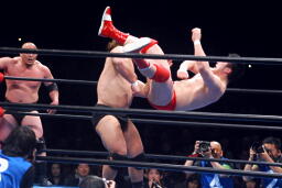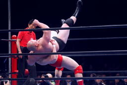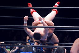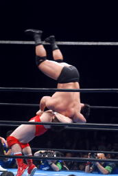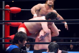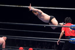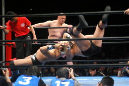諏訪魔ロープワークからフライングショルダーブロック(左写真)、ベリートゥベリー、カウント2。