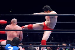 匠串刺しビッグブーツ(右写真)、首投げからサッカーボールキック、カウント2。