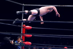 関本もコーナーに上ってダイビングボディプレス(右写真)、カウント2。