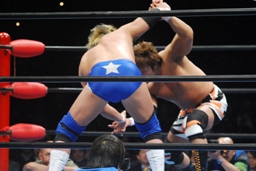 ロックアップ(右写真)、小島ロープに押し込む、ブレーク。ロックアップ、また小島がロープに押し込む、真田は体勢を入れ替えて張り手。