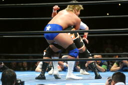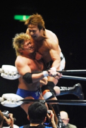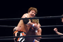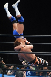 小島ラリアット、真田かわしてコブラツイスト(右写真)、小島はヒップトスでブレーク。小島がロープに飛ぶと真田は十字に交差する形でロープに走り、、小島を捕らえると再度コブラツイスト、引き倒してエビ固め、カウント1。