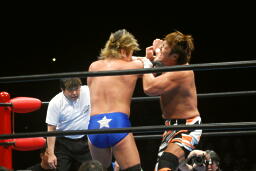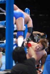 真田がコーナーからダイブ、小島は横殴りのラリアットで撃墜(右写真)。