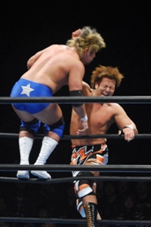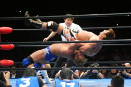 「行っちゃうぞバカヤロー!」はなしでダイビング・エルボードロップ(左写真)、カウント2。
