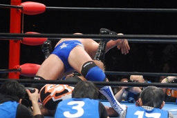 小島2発目狙うが真田はブロック。真田コーナーに振って串刺しエルボー、コーナーに上げて雪崩式フランケンシュタイナー(左写真)、カウント2。