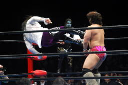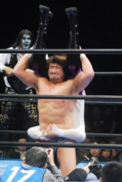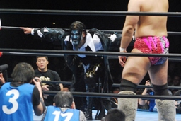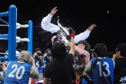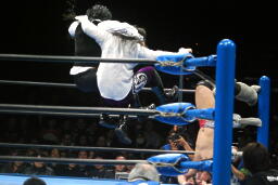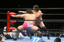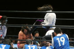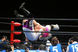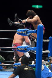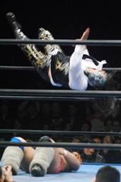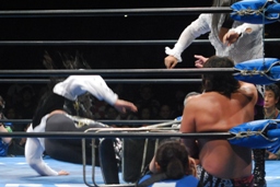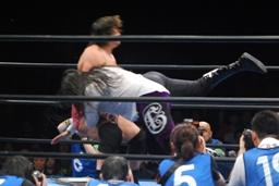 征矢がオズを場外に出す。大森腕を回して(右写真)アックスボンバー、クエルボブロック。