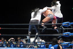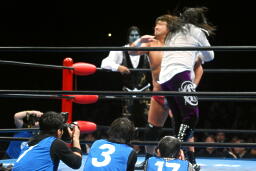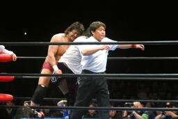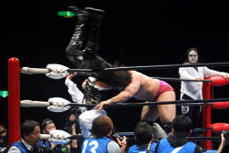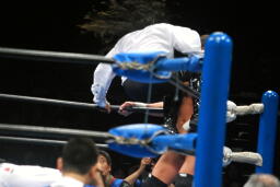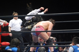 2度目はヒット(左写真)、カバーするがオズがボンバー斉藤レフェリーを場外に引きずり出してカウント阻止。さらにフェンスに投げつける。