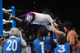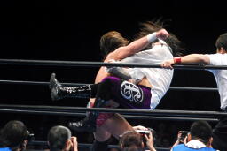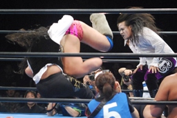 征矢ガットショット、クエルボDDT、ドロップキックで場外に落とす(右写真)。大森もコーナーから突き落とす。