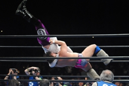 オズパンチ連打、大森キャッチしてフルネルソンボム(左写真)、征矢にタッチ。