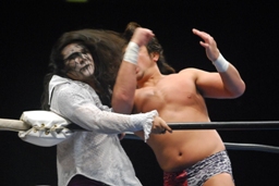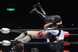 征矢「ワイルドに行こうぜー!」と叫んでショルダーネックブリーカー、カウント2。さらにカナディアンバックブリーカーに行くがオズは着地して急所打ち(右写真)。