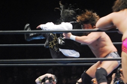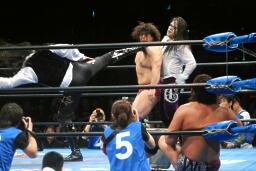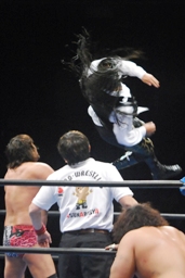 クエルボを呼び込んでダブルのクローズライン、征矢かわして2人にワイルドボンバー(左写真)、大森にタッチ。