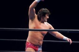 クエルボパンチ連打、ロープに飛んでショルダーブロック、大森打ち勝つと征矢を呼び込みダブルのチョップからポーズ(左写真)。