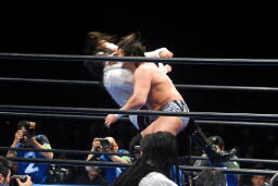 大森クエルボをコーナーに振って串刺しエルボー、征矢がコーナーに上って合体パイルドライバー(右写真)、カウント2。
