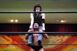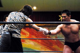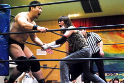 高木ヘッドシザーズ、ニラはブリッジから(左写真)後方回転し首を抜く。ニラ再度ヘッドロック、高木ヘッドシザーズ、ブレーク。