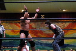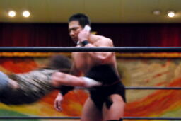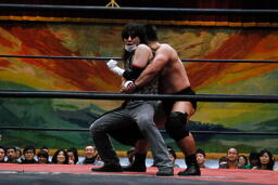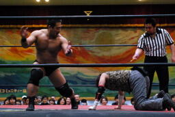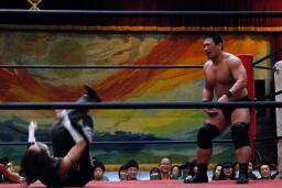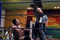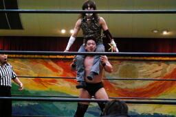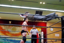 ニラハンマーロックからヘッドロック、フライングメイヤー(右写真)からグラウンドヘッドロック、高木エビ固めに、カウント2。もう一度エビ固め、カウント2。