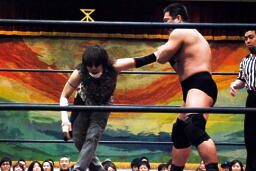 早速高木は手拍子を要請(左写真)。これが無理なくできるのが高木三四郎だよなあ。ニラロープに飛ぶ、高木バックエルボー、カウント2。