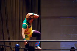 ウラノと彰人がリングに戻る。彰人片足タックルからバック取るとローリング(右写真)、トルコ刈り、とアマレステクニックを見せる。