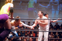 ウラノロープに振る、大石フライングエルボー(右写真)。ここで西城秀樹の「ヤングマン」が流れる。