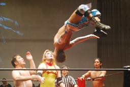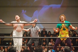 ウラノが福田にラリアット(右写真)、彰人がウラノにスピアー、矢野が彰人にクロスチョップ。