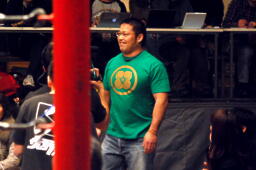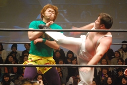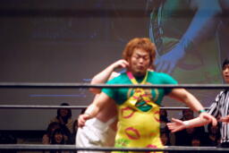 しかし「この人です!」という大石の言葉の後に流れたのはDDTでは聞きなれない入場テーマ。そして入って来たのはこのほどNOAHを離れフリーになった井上雅央!(左写真)そりゃ緑過ぎる。大石とは二丁目で知り合ったとか何とか。