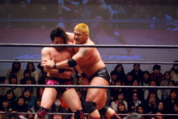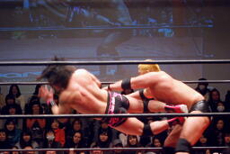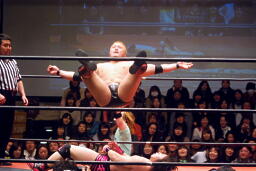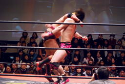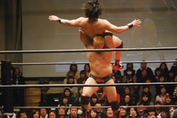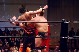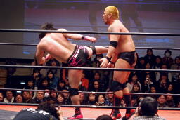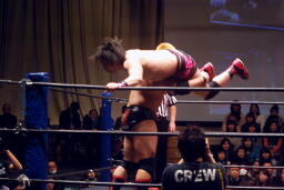 火野逆水平(右写真)、石井はミドルキック、ロープに飛ぶ、火野キャッチしてスパインバスター、カウント2。