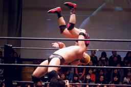 石井ダブルアームDDT狙う、火野持ち上げる、石井回転エビに(右写真)、火野切り返す、カウント2。