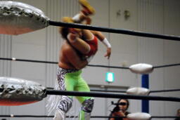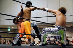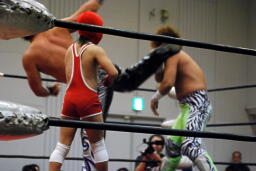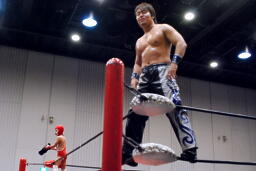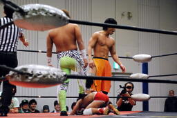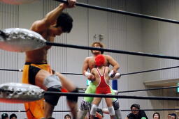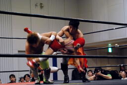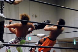 6号ポーズ(右写真)。高梨リングに戻る。HARASHIMAロープに振ってヒップトスからストンピング。HARASHIMAロープに飛ぶ、翔太リング下から両足をすくう。高梨は翔太にタッチ。