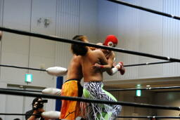 6号なんとか自軍コーナーに戻ってHARASHIMAにタッチ。HARASHIMAミドルキック3連打(左写真)。