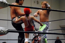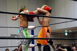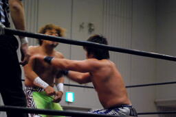 高梨踏みつけ、チンクラッシャー(右写真)からスリーパー。HARASHIMAヒジでブレーク、延髄蹴り。しかしタッチは翔太が阻止。5分経過。