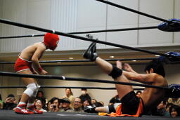 翔太エルボー、ネックブリーカードロップ(左写真)、カウント1。高梨にタッチ。