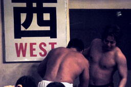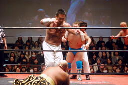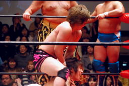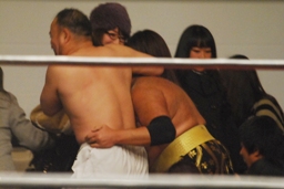 松永が高尾をリングに戻し踏みつけ。斉藤にタッチ。松永は尻を叩いて越中を挑発する(右写真)。