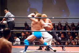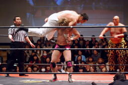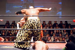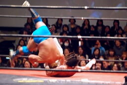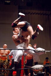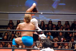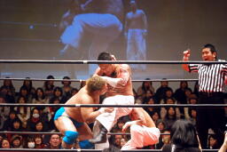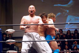 雪崩式ブレーンバスターに(右写真)。越中にタッチ。