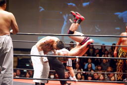 高木ドラゴンリングイン、石井カウンターのドロップキックからオーバーヘッドキック(左写真)。
