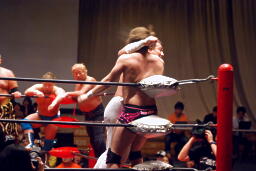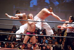 越中が石井をコーナーに振って高木が串刺しラリアット、高木が振って越中ジャンピングヒップアタック(左写真)。